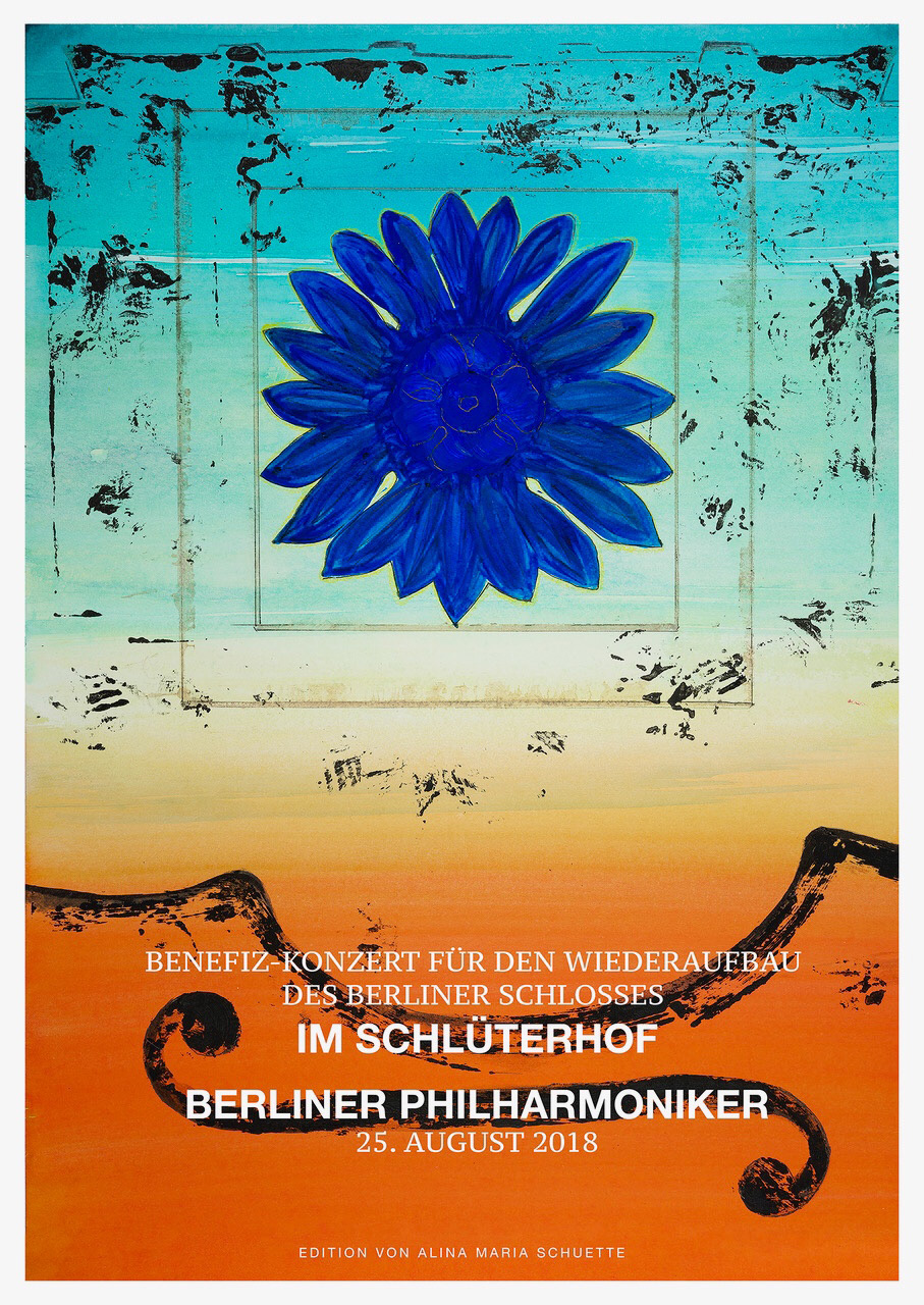 Anlässlich des großen Benefizkonzertes mit den Berliner Philharmonikern am 25. August 2018 im Schlüterhof vom Berliner Schloss hat die Berliner Künstlerin Alina Maria Schütte eine neue Kunst-Plakat-Edition herausgegeben.