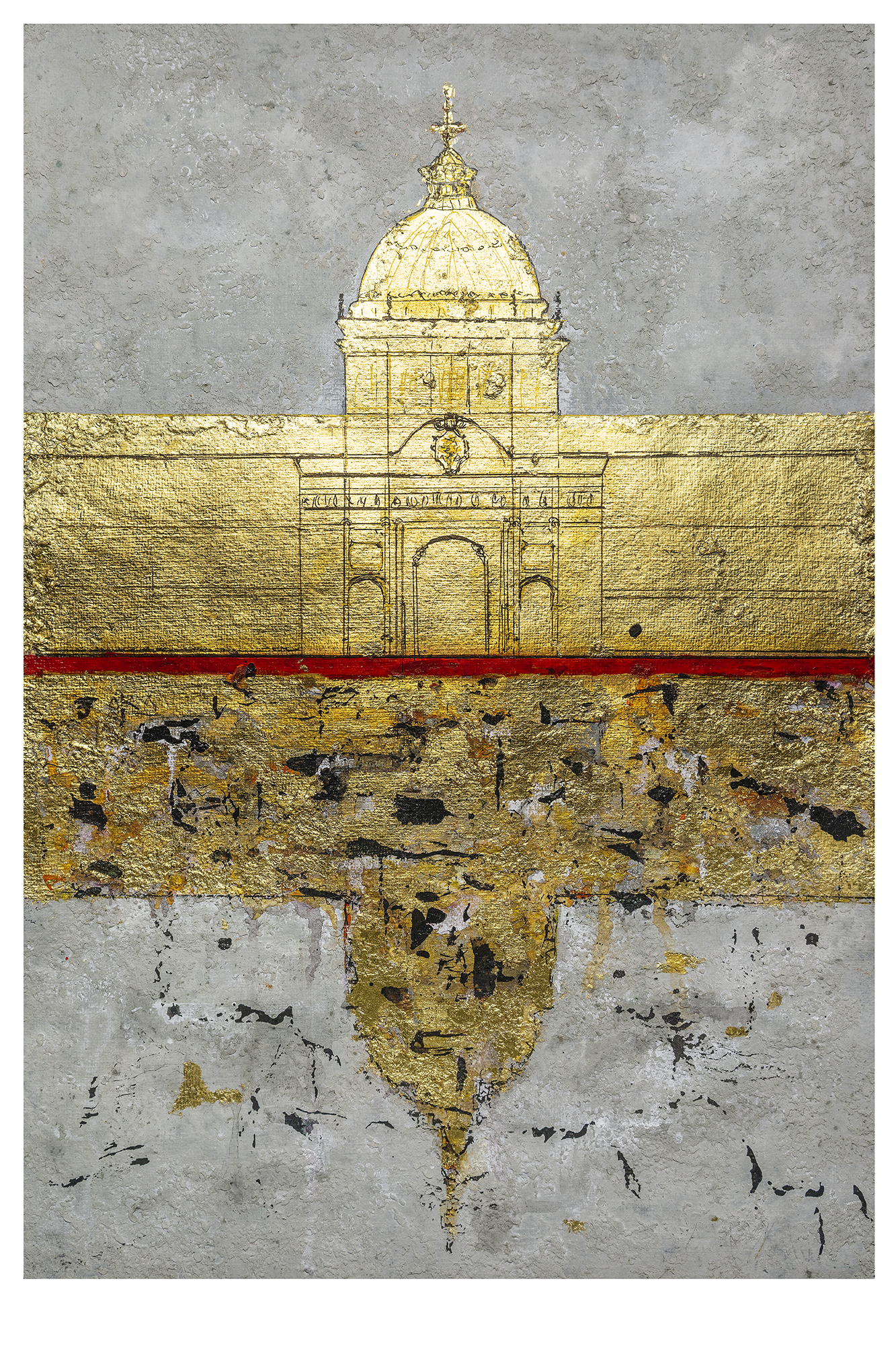 Die Edition für 2020 , das Jahr der Eröffnung des Humboldt Forum, ist im Blattgold 750 , auf einem grauen Hintergrund , gearbeitet. Die Künstlerin wählte das Gold als Symbol für die Fertigstellung der barocken Fassade des Schlosses und das Grau als Symbol für das Moderne des Humboldts Forums. Eine rote Linie symbolisiert die Grenze zwischen der Vergangenheit und der Gegenwart. Das untere Schloss Motiv als Symbol für die geschichtliche Spiegelung - die Zerstörung des Schlosses und das obere Schloss Motiv für den Wiederaufbau und das Humboldt Forum.