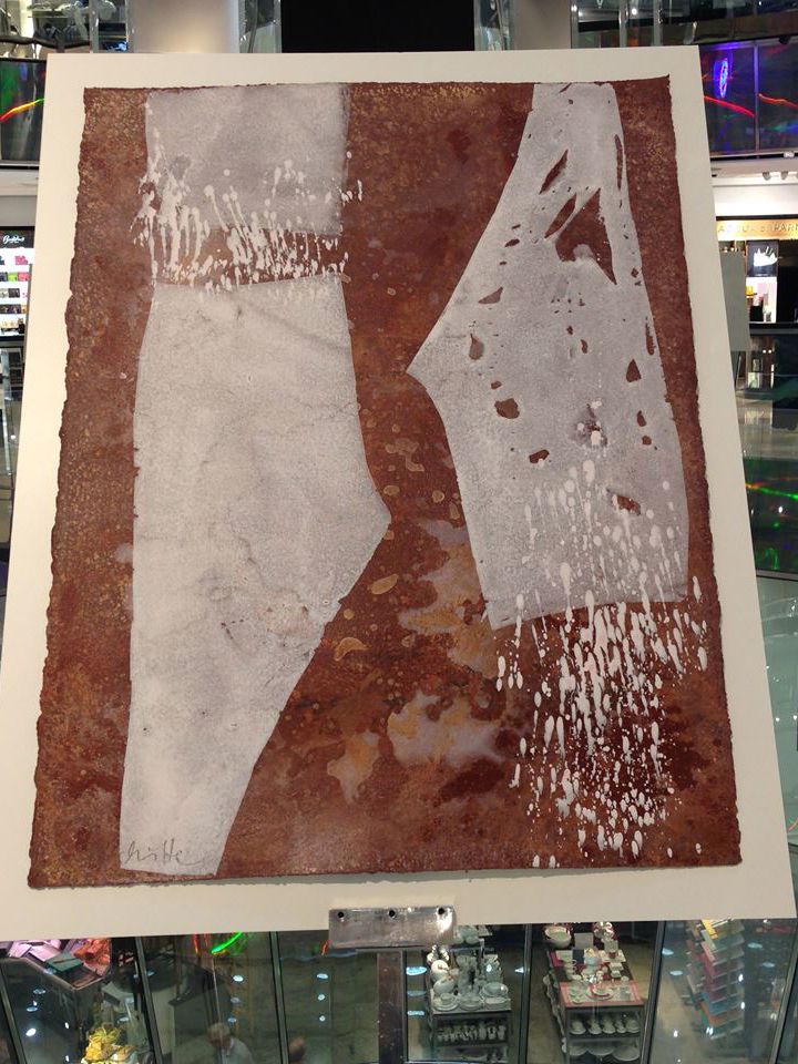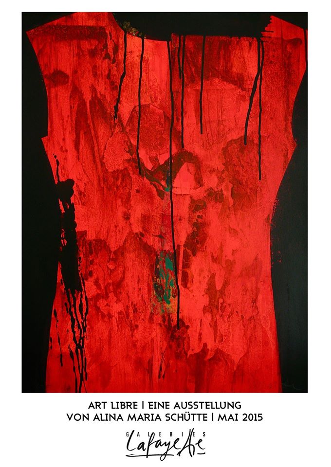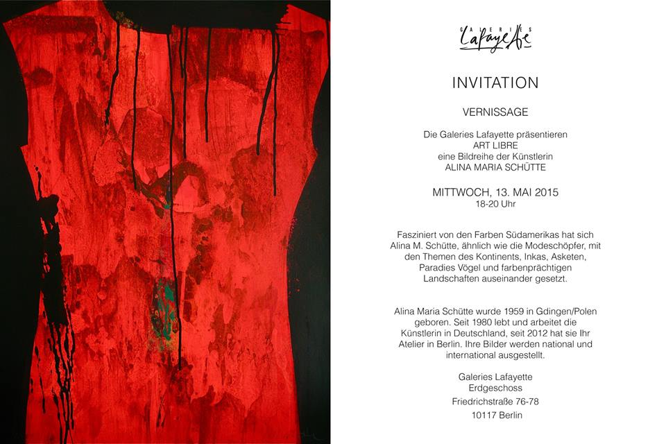 In einer Auseinandersetzung mit den Themen und Farben, wie sie sich auch in den Kollektionen internationaler Modeschöpfer in diesem Sommer finden lassen, präsentiert Alina M. Schütte unter dem Stichwort ART LIBRE, ihre Bildreihe als Inspiration zu den Motiven der Kulturen der Inkas und der Azteken sowie der Landschaften Südamerikas. Natürliche Materialien wie Kork, Holz, Stein oder Metall, sowie kraftvolle Naturereignisse voller Feuer und Explosion und die Fauna des Regenwaldes werden in ihrer Textur und farblichen Intensität in den Werken verarbeitet. Die Künstlerin schafft somit in verschiedenen kontrastreichen Einheiten Felder der Farbe, die die Fläche als Ganzes bespielen und in ihrer Texturierung akzentuieren. Der Zyklus ART LIBRE unterteilt sich in zwei Sequenzen von Arbeiten, als kleinformatige Bilder auf schweren Aquarellbögen und großformatige Zellstoffplatten. Die Träger aus Zellstoffplatten bilden hier eine inhaltliche Spannung in der Anmutung von Stoff. Somit schließt sich in einer Analogie zwischen Zellstoff als Rohstoff für Papier und Textil seinerseits als Rohstoff der Mode ein materieller Kreis der Referenz in der Stofflichkeit. Die hier zu sehenden Werke heben sich ebenfalls als Objekte in ihrer Materialität vom Raum ab, sowohl in der physischen Beschaffenheit, als auch in der thematischen Verschränkung. Konsequent in ihrer Malweise bewegt sich die Künstlerin im gewohnten Raum der Abstraktion baut hier jedoch eine subtile figürliche Qualität in ihre Bilder ein, die eine Assoziation zum Prozess des Modeschöpfers hervorruft. Die kubistischen Motive entfalten sich entweder explizit in graphischer Linie oder als bloßer Abdruck und basieren auf Schnitten aus dem Atelier einer mit der Künstlerin befreundeten Berliner Modedesignerin, Aleks Kurkowski. In den Werken wird somit eine weitere Interaktion zwischen Motiv und Fläche erkennbar, in dem Verweis zu Schnitt und Stoff in den Ateliers der Modewelt. Die Werke in zwei Formaten (56x76cm, 120x140cm) bespielen die Räumlichkeiten des Hauses Lafayette und bringen die freie Kunst über die freie Mode in einer aufmerksamen Verschränkung zusammen.