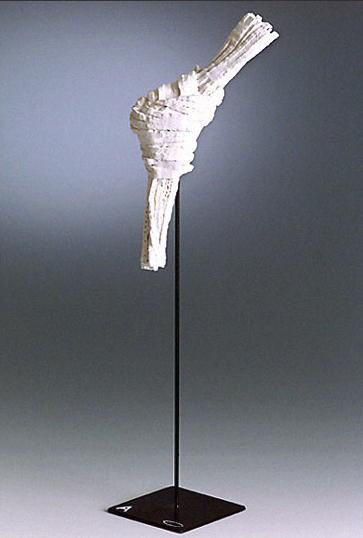 Die Plastik ist aus Papier, Acrylmasse und weißer Farbe hergestellt.