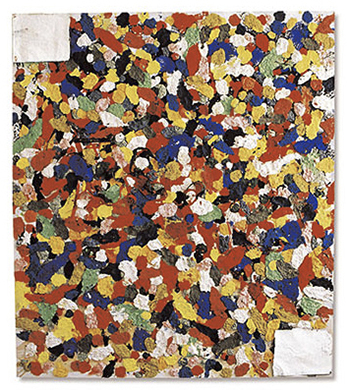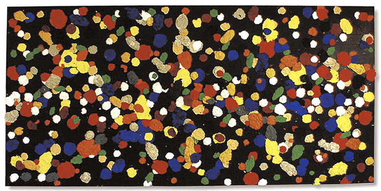 ihres rechten Armes solche farbigen Zellstoff-Fladen auf diese Leinwand zu werfen.